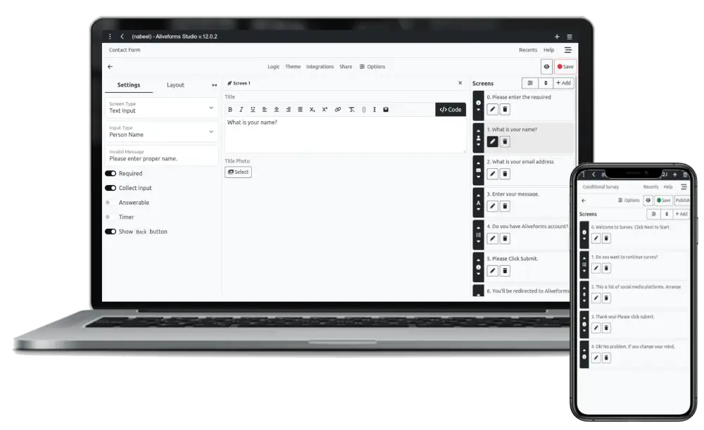 Aliveforms offers easy-to-setup conditional branching and powerful scripting capabilities. Build simple flows or complex logic without code. Use plugins to extend functionality or create own reusable logic modules. Use JavaScript for advanced functionality like voice input. Endless possibilities await!